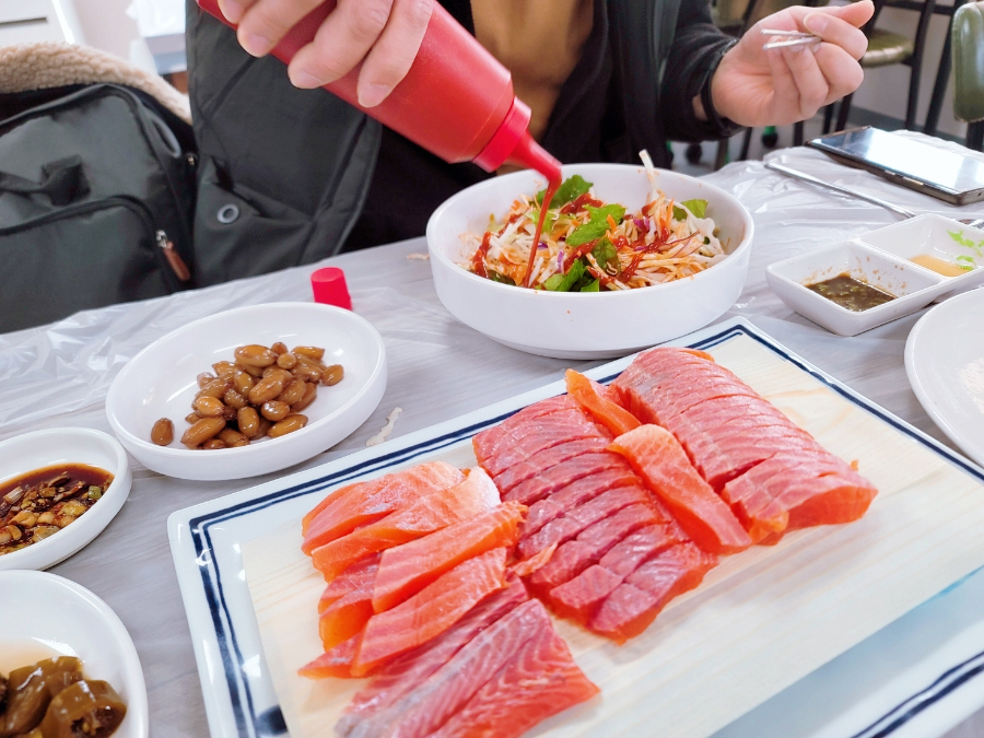 물론 송어회는 그냥 먹어도 맛있고 간장에 찍어 먹어도 맛있고 와사비와 함께해도 맛있고 초장에 찍어 먹어도 맛있습니다. 쌈에 싸서 먹어도 물론 맛있죠. 결론은 어떻게 먹어도 맛있지만 조금 더 맛있게 다양한 방법으로 먹어보면 더욱 좋습니다.