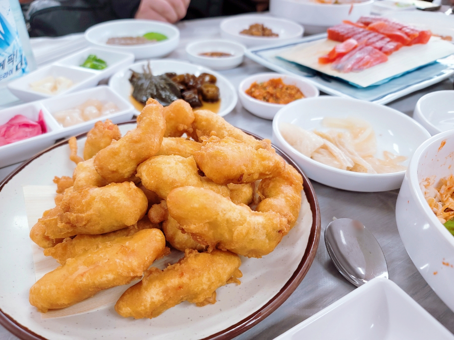 저희는 신랑과 둘이 먹을꺼라서 송어회와 향어회를 시킬것인가 아니면 송어회와 송어튀김을 먹을것인가 고민을 했는데요 (사실 송어회 향어회 송어튀김 전부 먹고싶었지만 분명히 다 못먹고 남길 것 같아서 자제를 했습니다) 그 결과 송어회와 송어튀김을 먹기로 결정했는데 이 결정이 너무나 잘한 결정이었습니다. 왜냐하면 저희 부부도 맛있게 먹었지만 아이가 저희보다 더 맛있게 먹었기 때문입니다. 다음날에도 송어튀김 먹으러 가자고 할 정도였으니까요. 송어튀김은 그냥 간장에 찍어먹어도 맛있지만 깻잎에 버무린 양배추채와 함께 싸서 먹어도 꿀맛이었습니다. 고소함 그 자체였던 송어튀김!