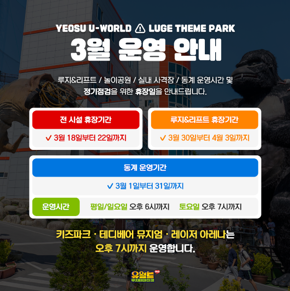 전 시설 3월 18일부터 22일까지 휴장이었고, 루지&리프트는 다가오는 3월 30일 부터 4월 3일까지이다.